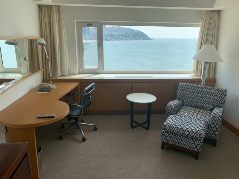 3.823호는 호텔의 고층에 해당한다. 웨스틴조선의 바다 전망은 정면이 아닌 사이드로 바다를 바라보고 있다. 해운대의 다른 호텔들 예를들면 파라다이스 호텔은 정면의 바다를 보고 있지만 개인적으로는 측면바다 뷰의 웨스틴조선을 더 선호한다.