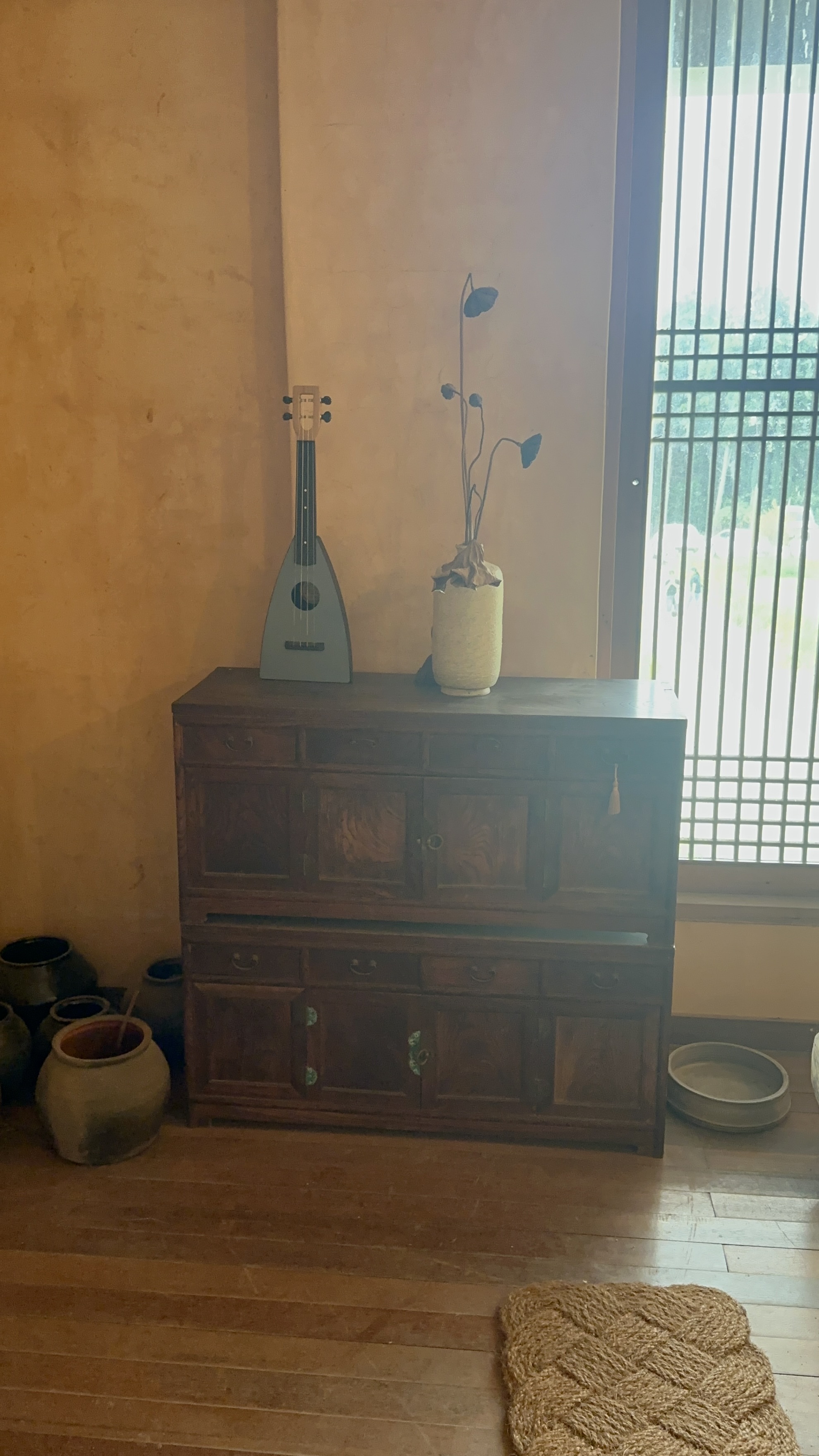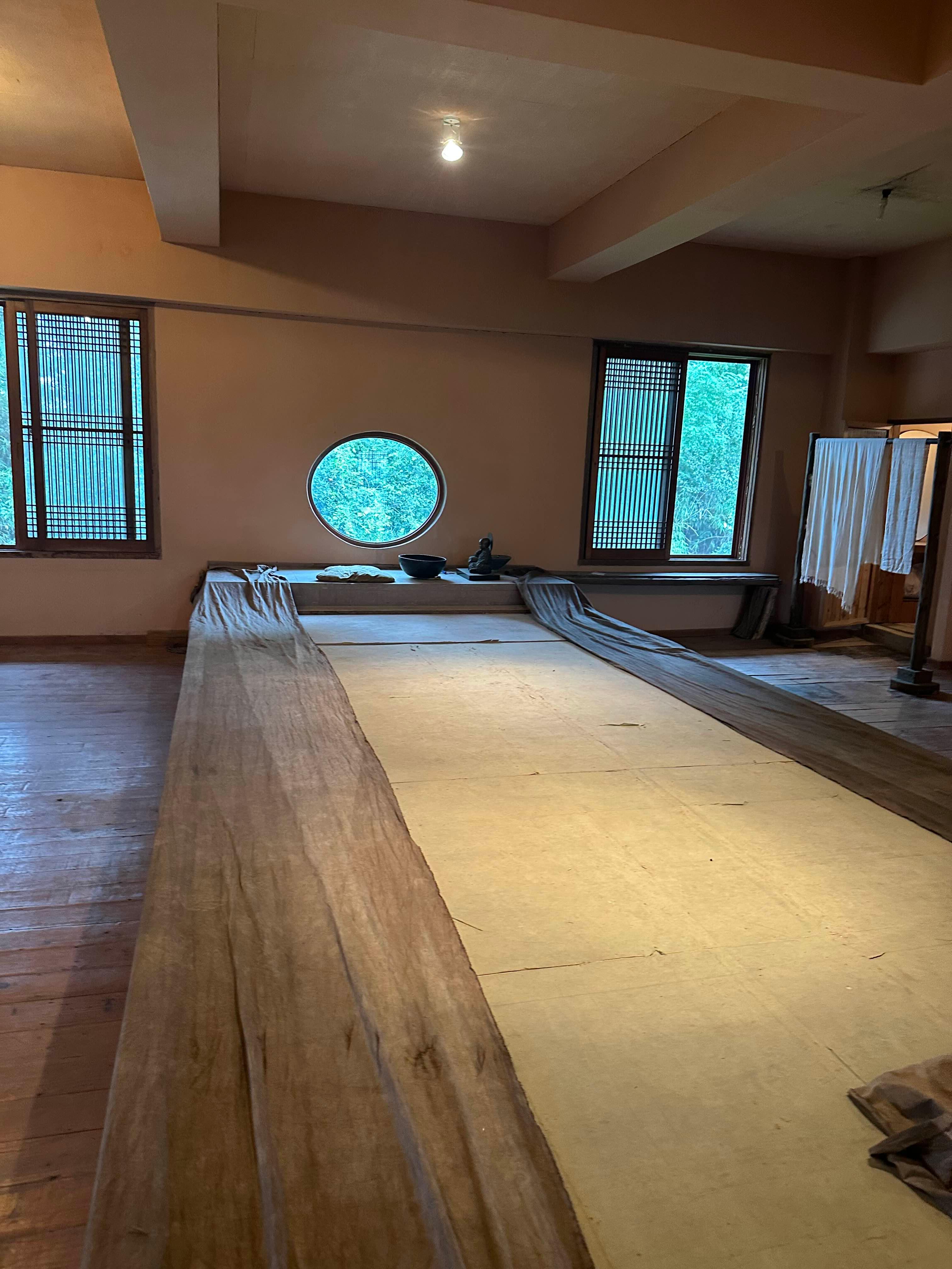 긴 천으로 덮인 조형물이 가운데를 차지하고 있었고 둥글게 난 유리창이 일본 주택을 연상시키기도 했습니다.