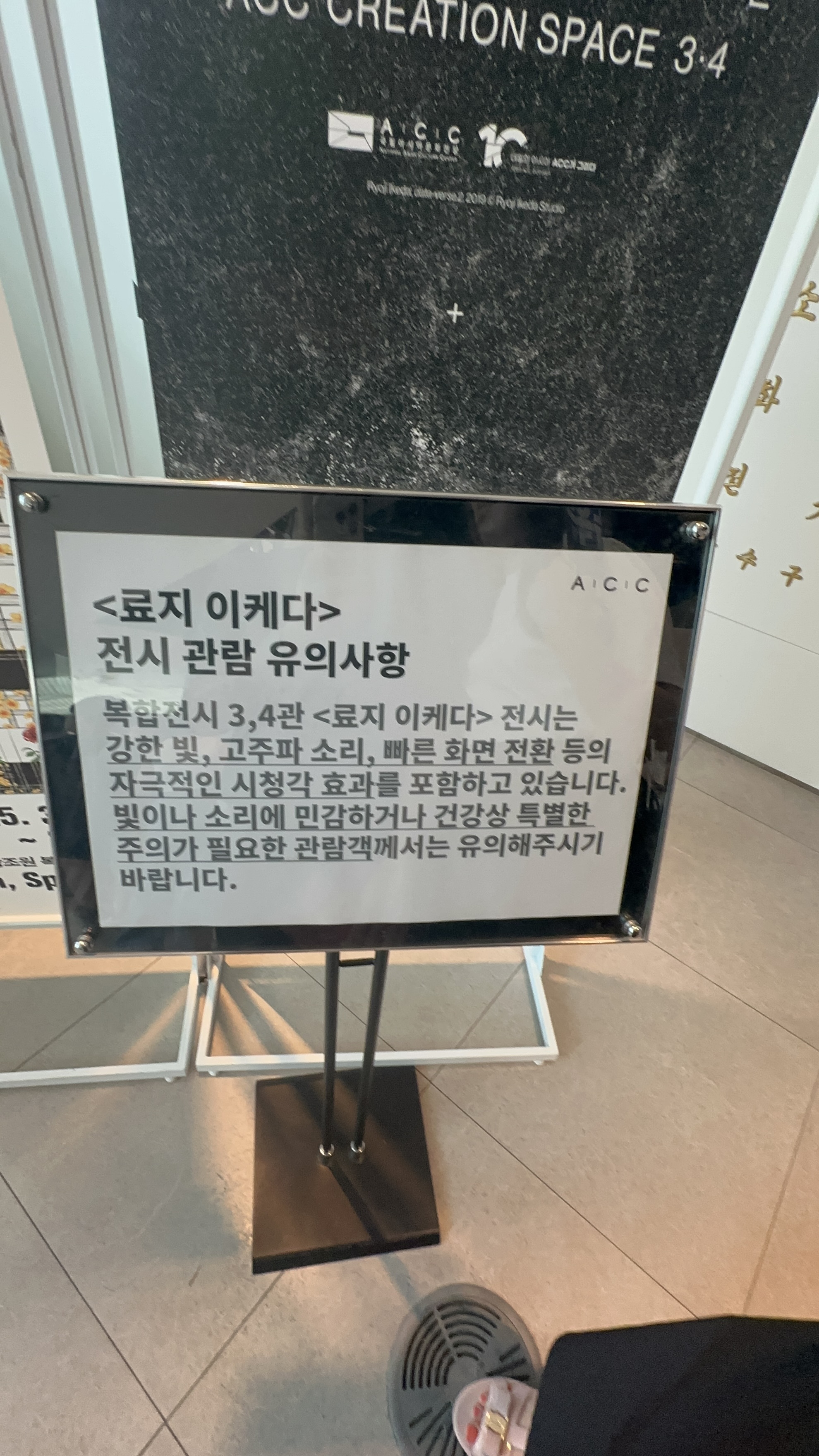 강한 빛, 고주파 소리, 빠른 화면 전환 등의 자극적인 시청각 효과를 포함하고 있으니 소리에 민감하거나 건강상 특별한 주의가 필요한 관람객은 유의하란 문구였다.