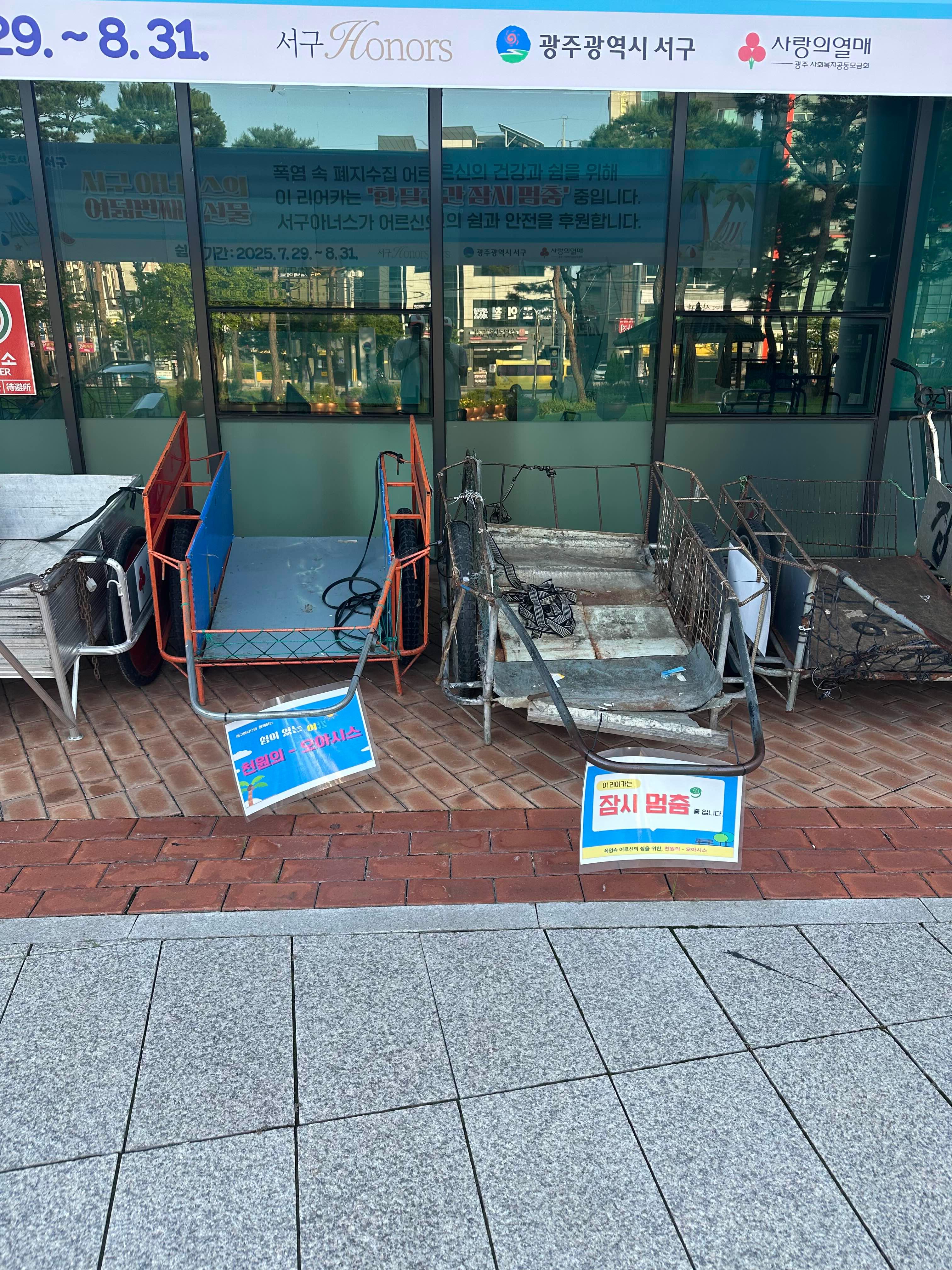 가까이 다가가서 보니 폭염에 폐지 수집 어르신들의 건강을 위해 "잠시 보관" 하고 있는 리어카들이었다.