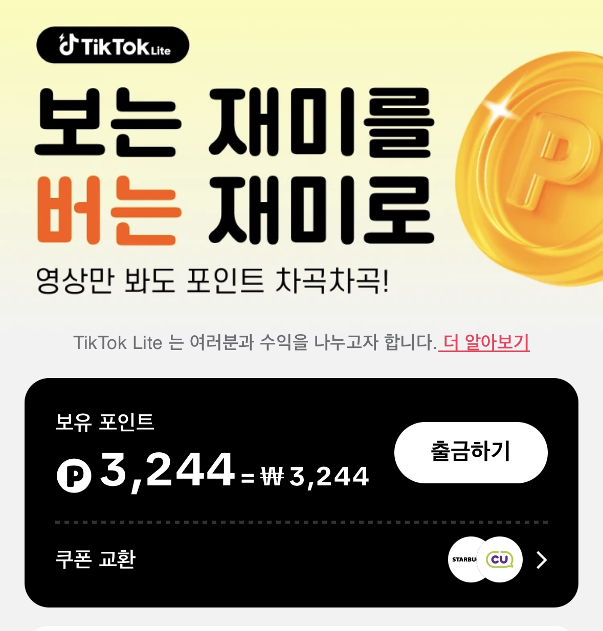 별개로 틱톡을 사용하면 날마다 "출석 클릭", 20분마다 클릭, 북치기 그리고 영상만 봐도 계속 포인트를 준다.