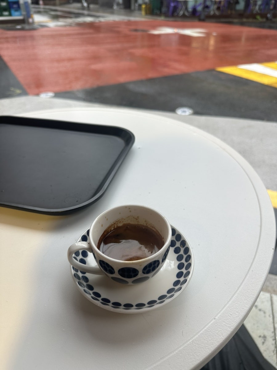 빗줄기를 감상하며 에스프레소를 조금씩 홀짝였는데 커피 양은 적은데 공복인 속이 너무 쓰라렸다.