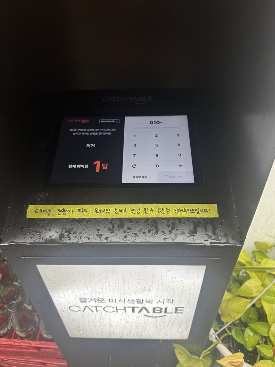 11시가 되자 "꺼거" 앞 캐치테이블 기계에 웨이팅을 걸었다. 우리가 2번째였다.정확히 11시 30분이 되자 "입장"해주라는 문자가 왔다.