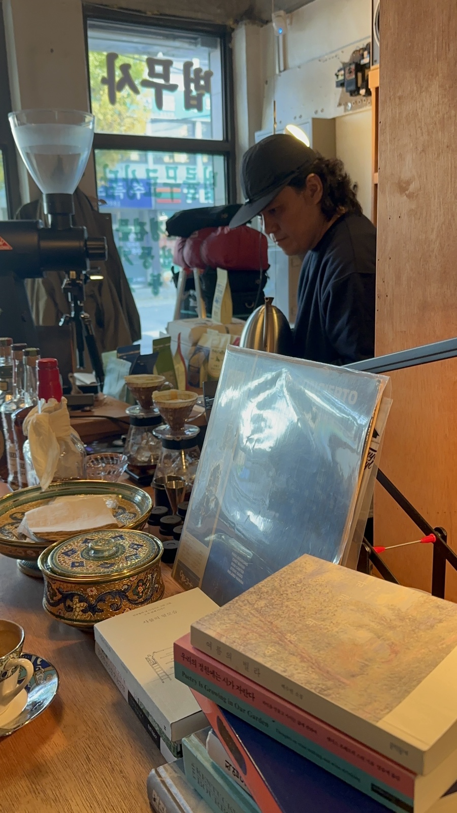 테이블 너머로 사장님이 정성스럽게 커피를 만드는 모습이 보였는데 구경하는 재미가 있었습니다.
