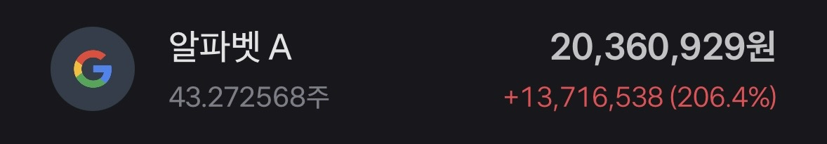 현재 알파벳 수익률은 200%가 넘고 총금액은 2천이 조금 넘는다.