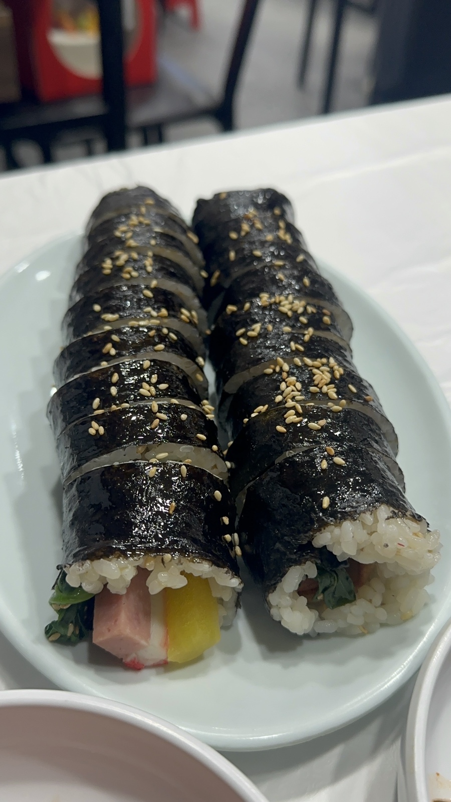 김밥 위에 양념을 묻힌 생고기를 올려 애피타이저로 먹었는데 궁합이 기가 막혔다.