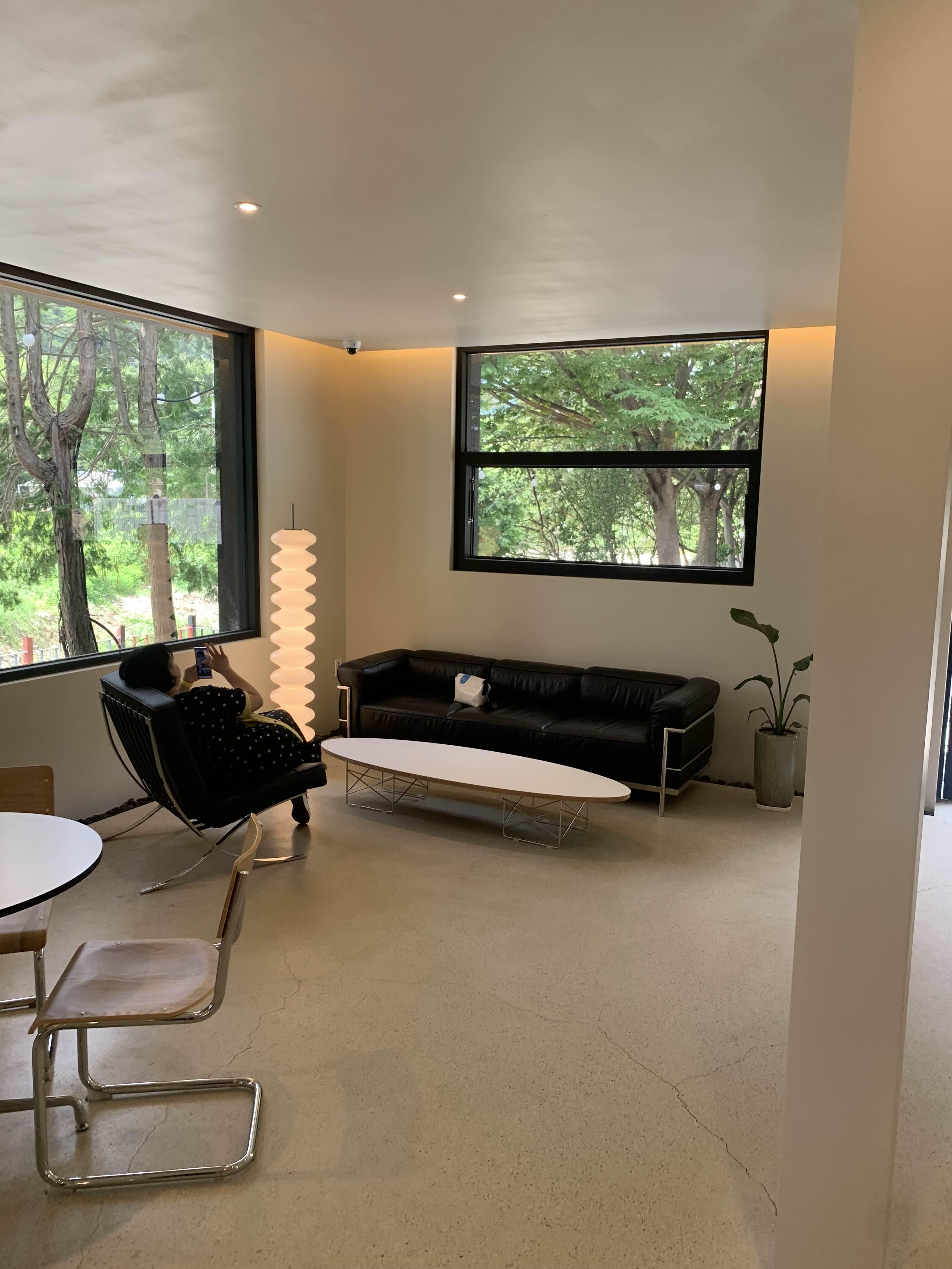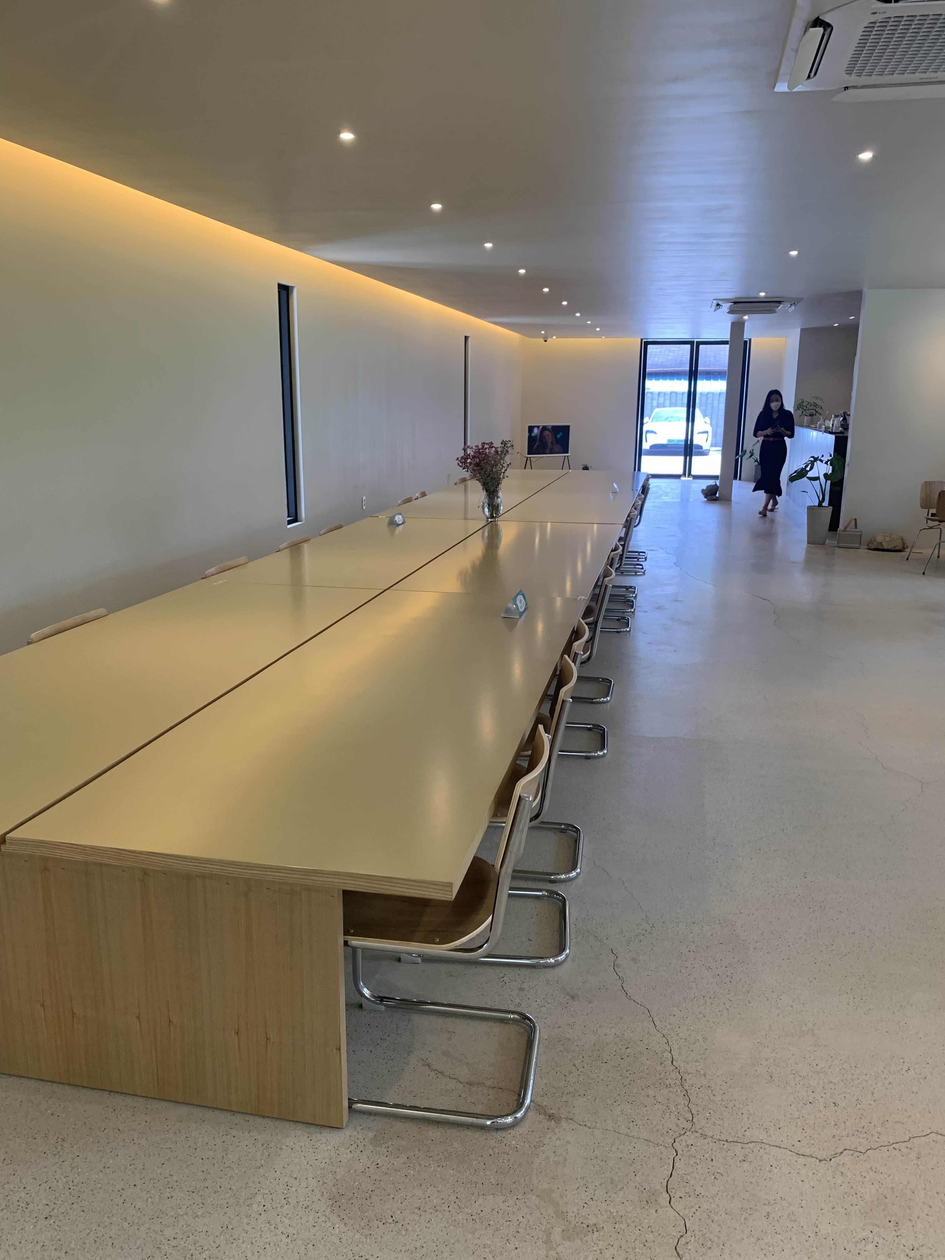 카페 실내석도 군더더기 없이 심플한 디자인으로 길다란 회의실 모양의 탁자와 3-4개의 테이블이 갖추어져 있습니다.