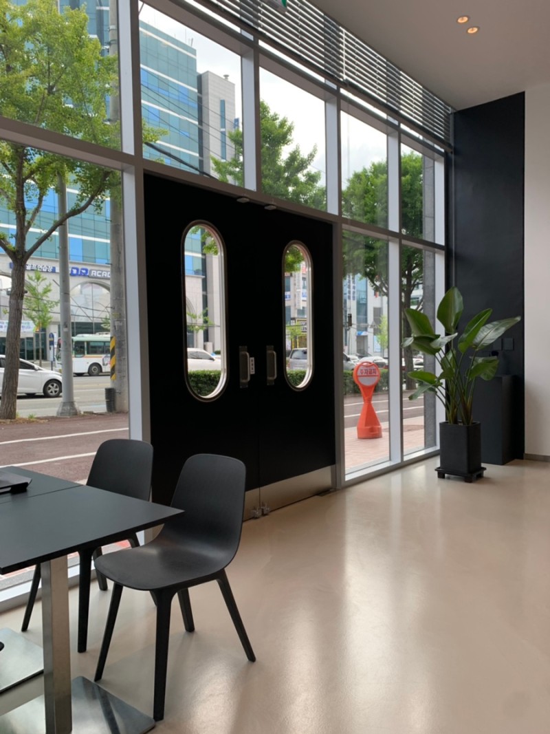 "카페 아스트로"라고 이름 지어진 곳에 와이프와 들어갔습니다. 디자인은 깔끔, 심플, 그리고 까만색 출입문이 눈길을 사로잡았습니다.