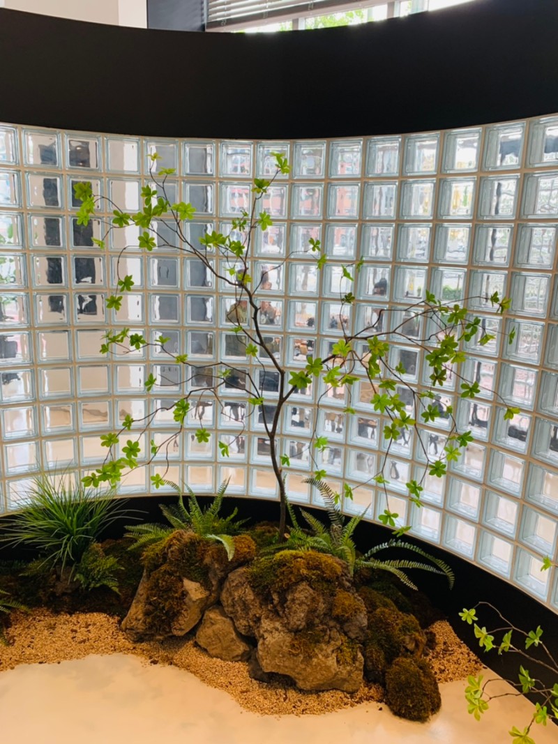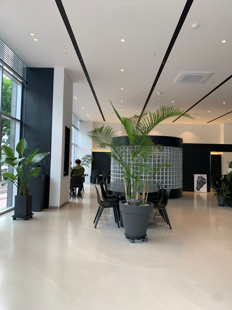 커피를 주문하고 화장실 가는 길에 유리블록 벽으로 둥글게 둘러싸인 곳이 보였습니다. 안을 들여다보니 가늘한 나무와 식물이 자리 잡고 있습니다. 그 안에 테이블이 놔두고 앉아 있어도 좋을 것 같은데 식물에게 양보하여 카페에 여유를 주신 것 같습니다.