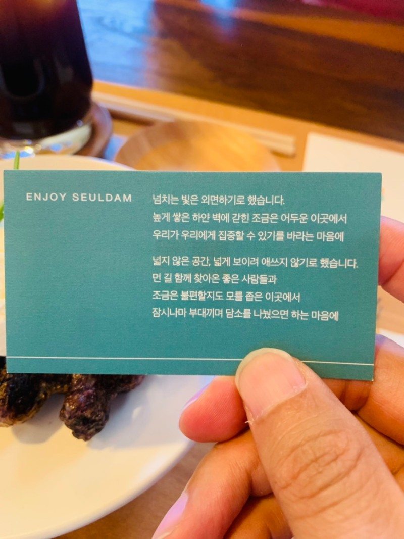 커피와 함께 나오는 조그만 명함 종이에 "슬담"이란 공간을 어떻게 만들었고 운영하고 싶은지가 명확하게 적혀져 있었다.