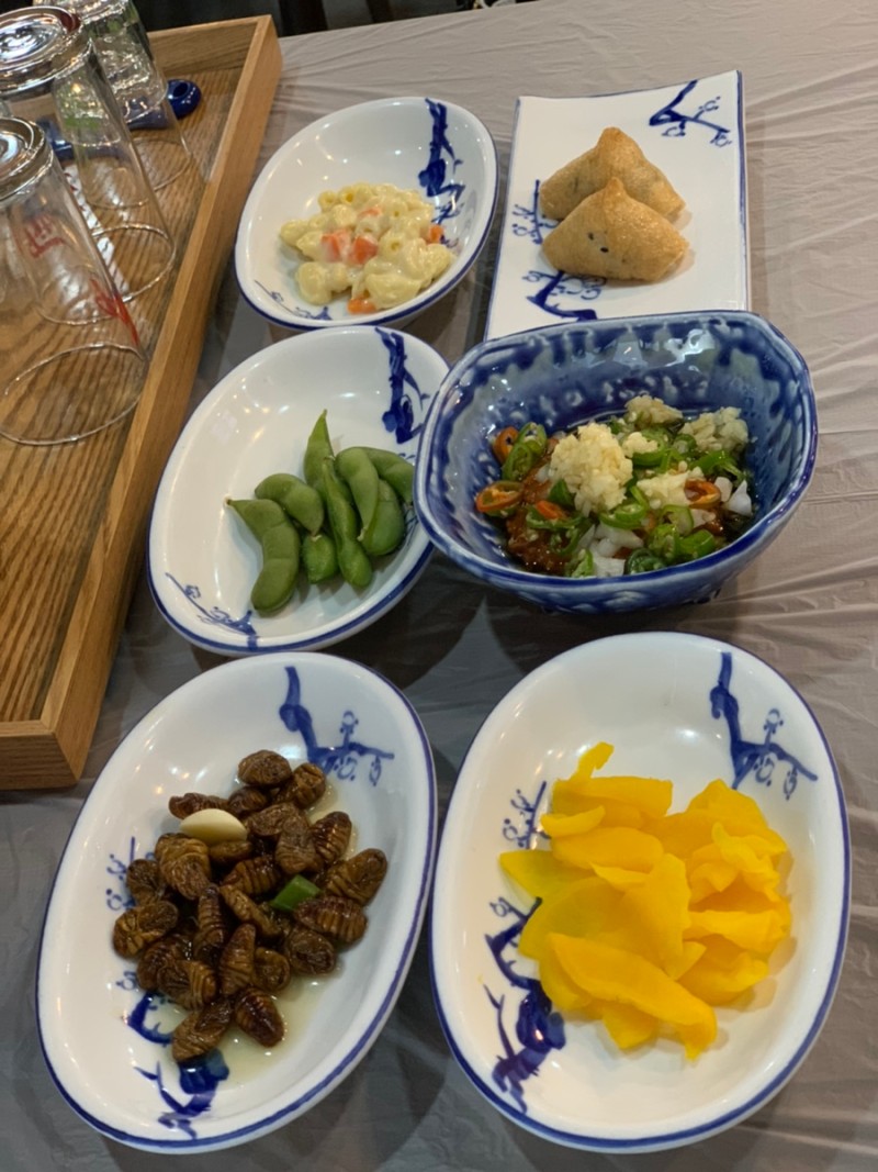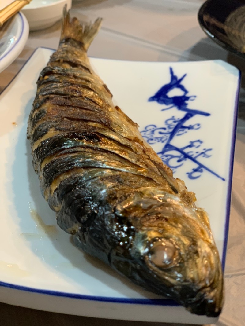 유비끼를 올려 초밥을 만들어 먹을 수 있는 밥 덩어리, 잘 구어진 생선, 튀김들, 번데기, 치즈 콘 샐러드, 전과 알밥 그리고 인당 5천원인 매운탕까지 맛있게 먹을 수 있습니다.
