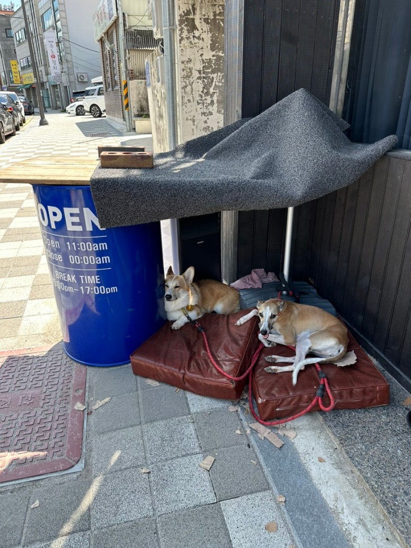 점심을 맛있게 먹고 식당 앞에 앉아 있는 웰시코기 대박이와 그레이 하운드(이름은 까먹었다) 와 놀다가 왔다.
