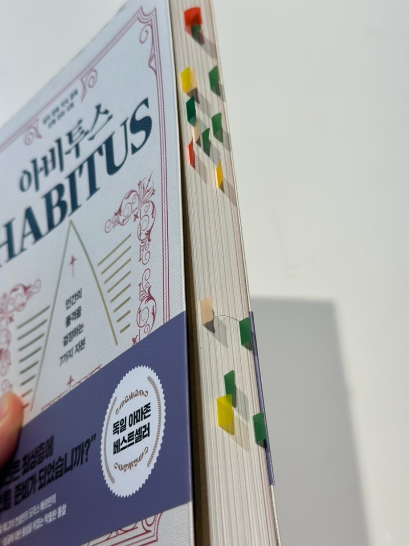 "아비투스"를 읽으며 많은 곳에 밑줄을 긋고 색깔 띠지를 붙였다. 그만큼 인상깊은 구절이나 기억하고 싶은 글귀가 많았다.
