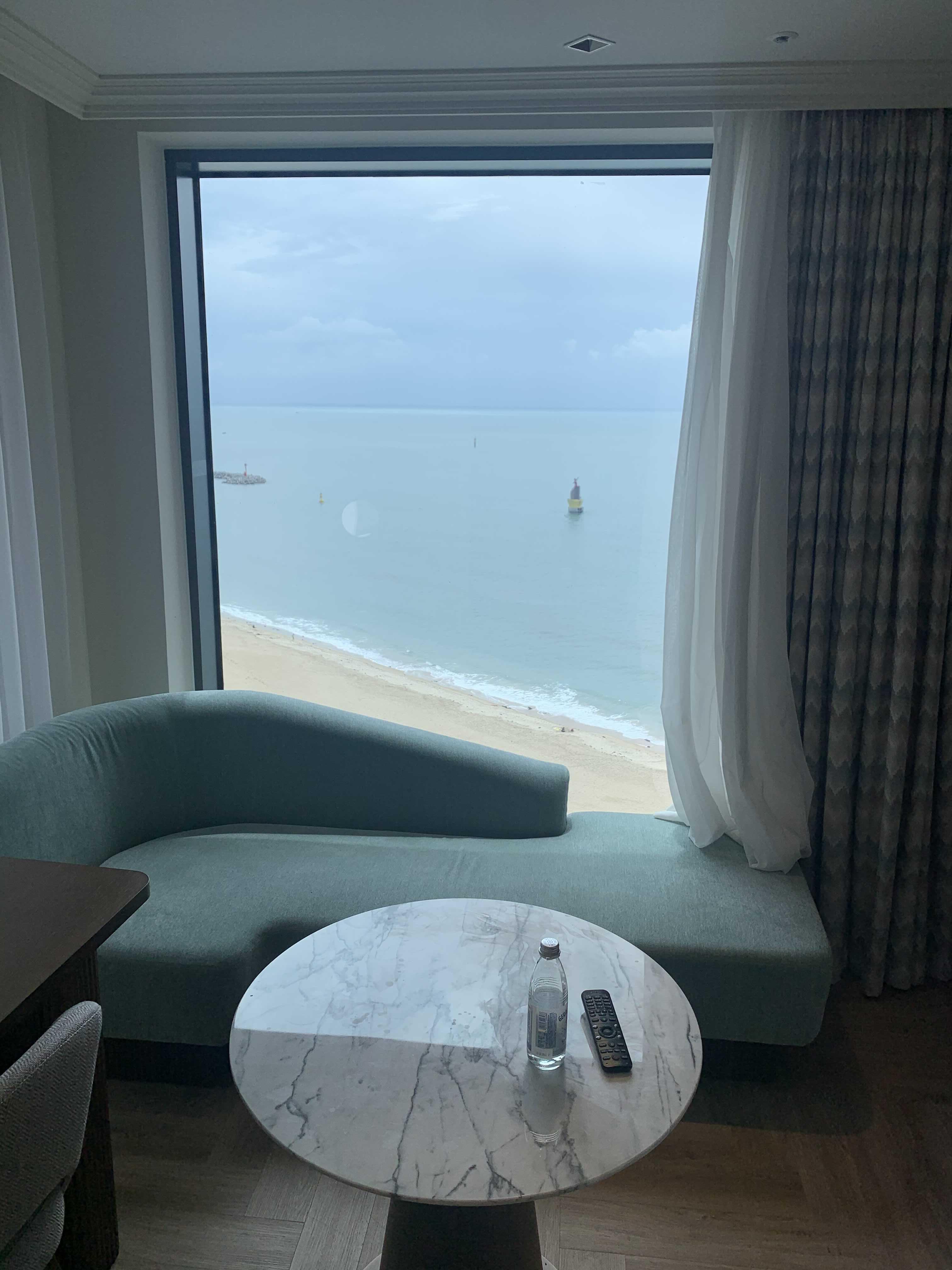 4. 그런데 막상 방에 들어오니 바다정면 뷰는 아니었습니다. 살짝 비스듬하게 해운대 바다가 보이더군요. 저희에게 배정된 1613호는 가장 높은 층이었지만 높게 느껴지지 않았습니다.